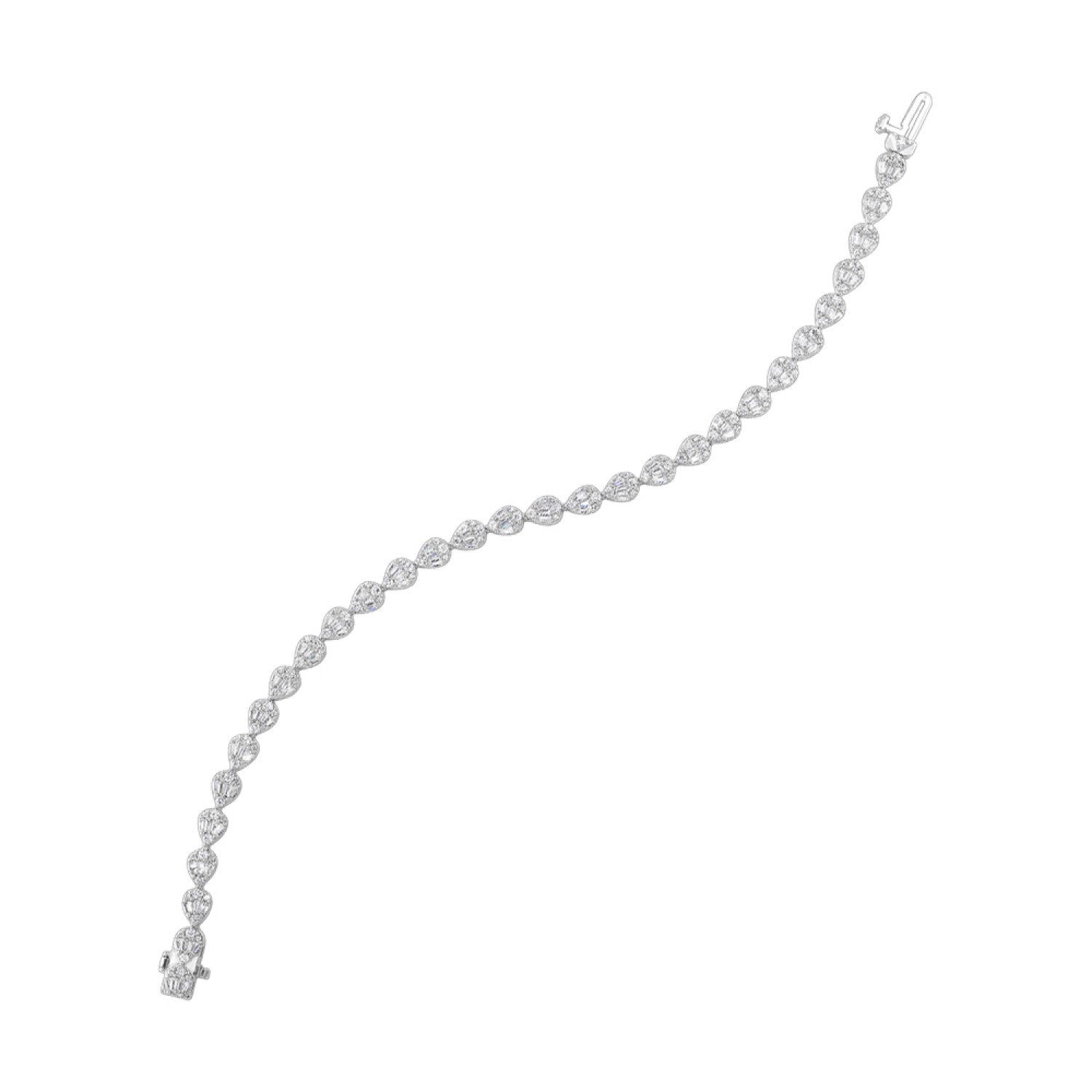 This stunning bracelet features round and baguette cut diamonds in pear shaped settings. This elegant design is sure to impress whether as a treat for yourself or a gift for that special someone.