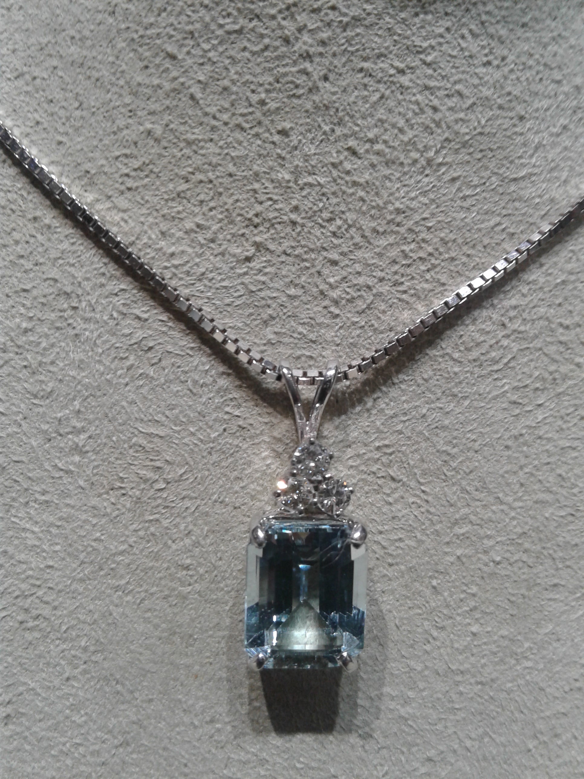 14KW 8X10mm AQUAMARINE AND THREE DIAMOND PENDANT ON 18” WHITE BOX CHAIN