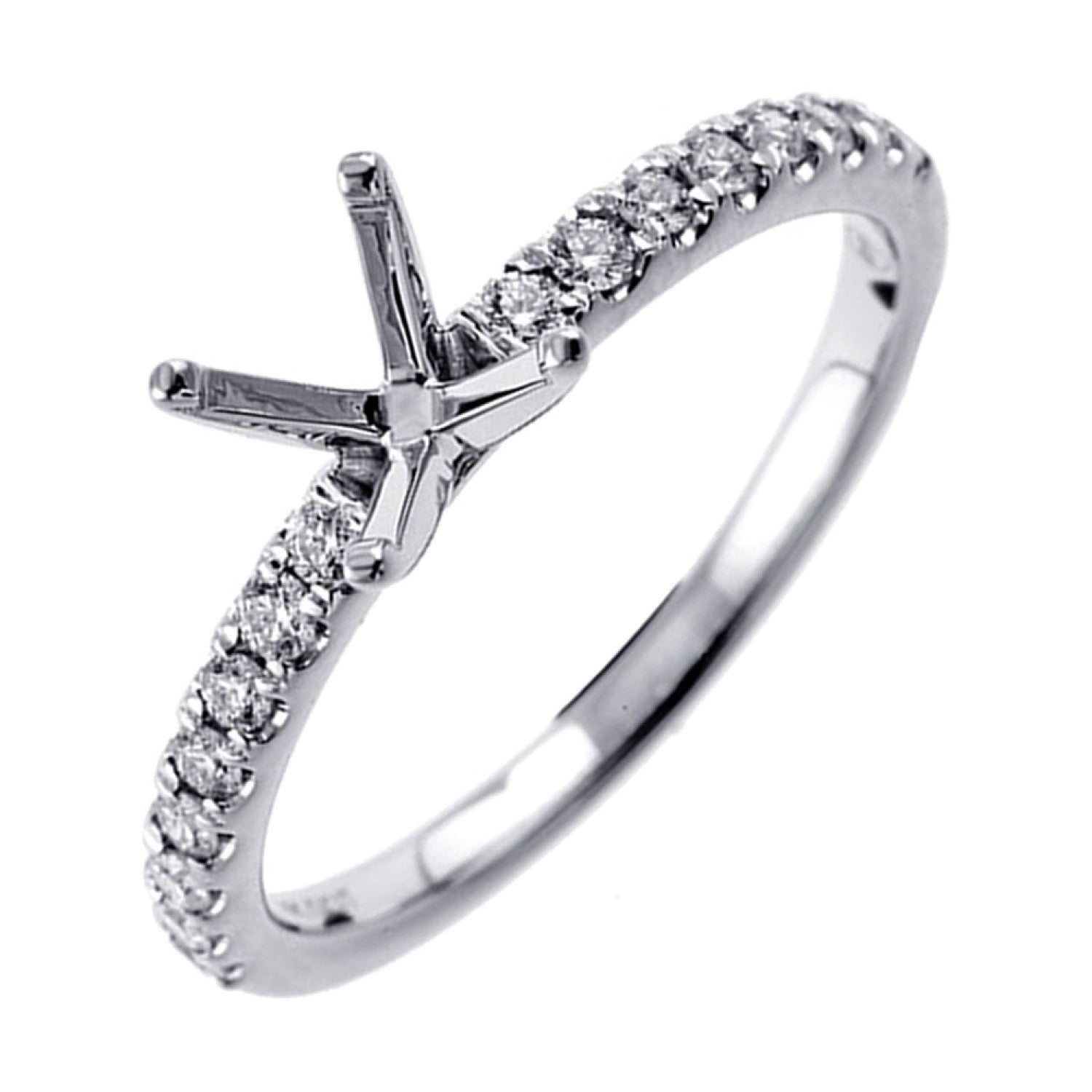 This stunning semi-mount engagement ring features beautiful diamond accents (1/4CTW) in a 14K white gold setting. The center four prong mounting can accommodate a 1 carat round stone. This semi-mount does not include the price of a center diamond and allows you to pick out the perfect center stone to create a truly perfect ring.