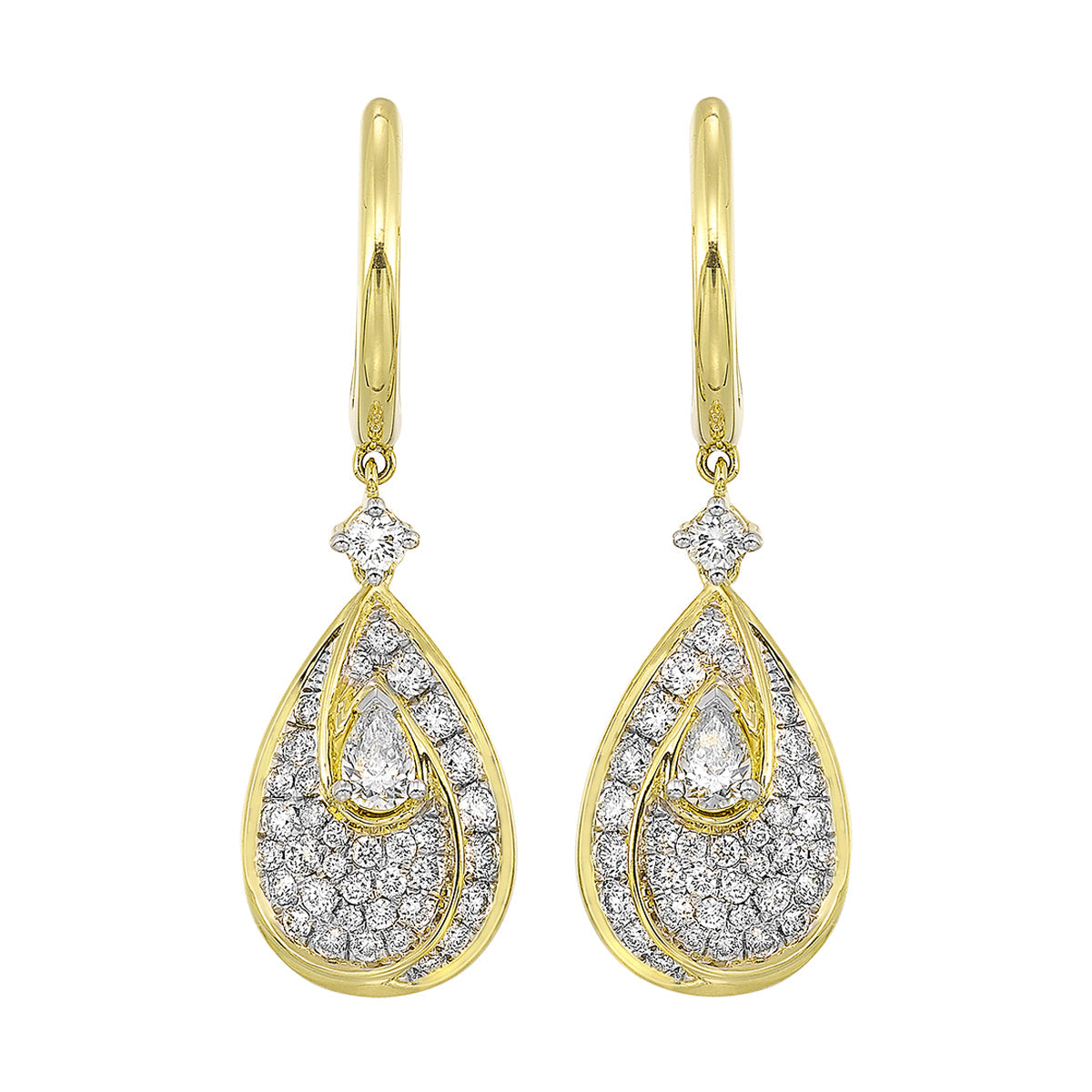 Celebrate the season with these luxurious 14Kt yellow gold diamond earrings. With 74 sparkling diamonds totaling 1.09ctw, they are a perfect holiday gift for someone you love.