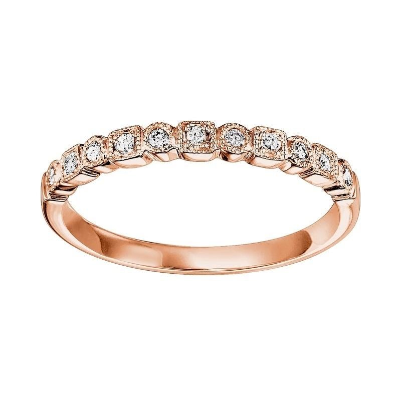 This super-chic diamond band is right on-trend with its brightly polished gold design. Sparkling round brilliant cut diamonds are set on the top of this ultra-slim band and sit nestled in an alternating pattern of round and square-shaped bezels along the top. Versatile and modern, this lightweight ring features milgrain beaded edges giving it an antique style.