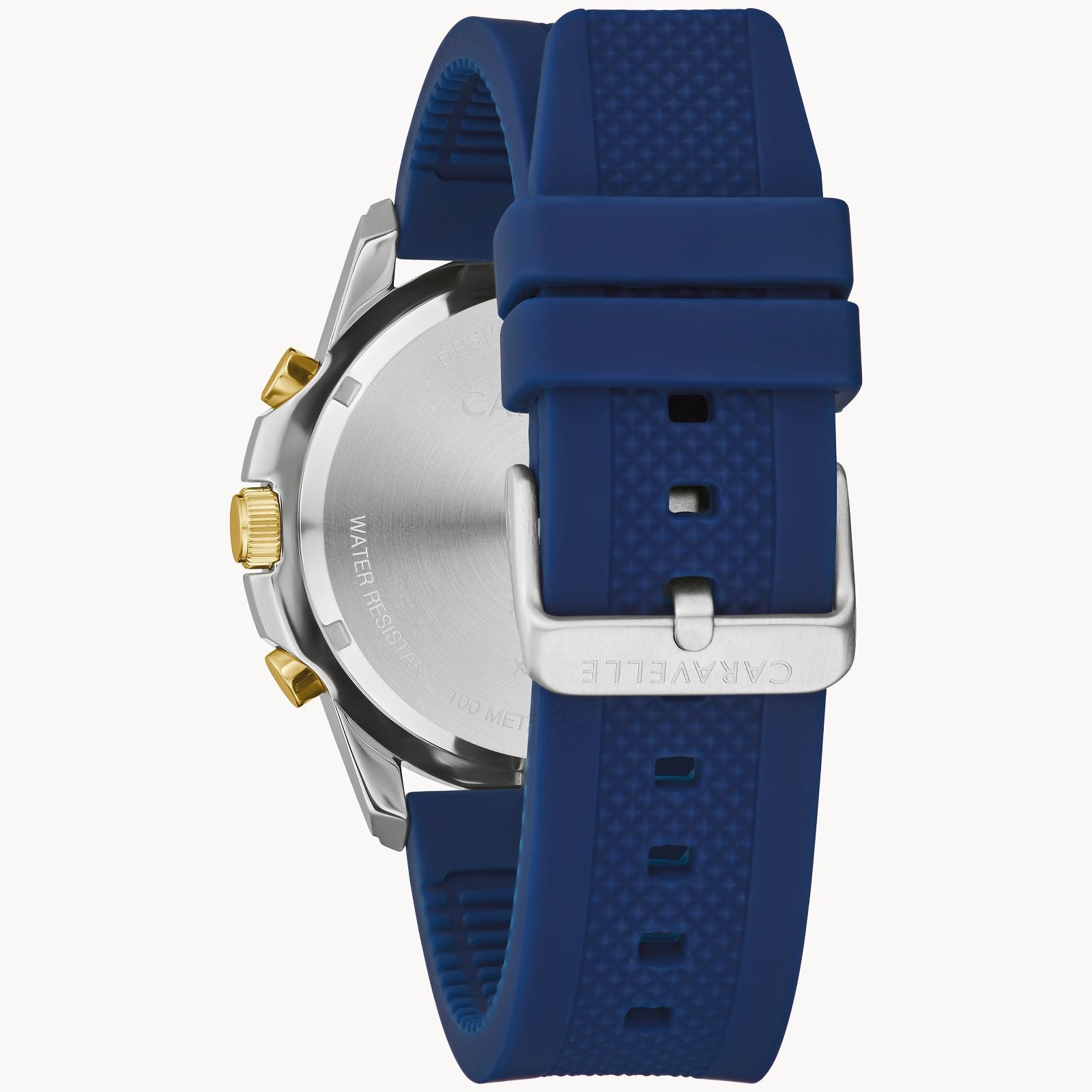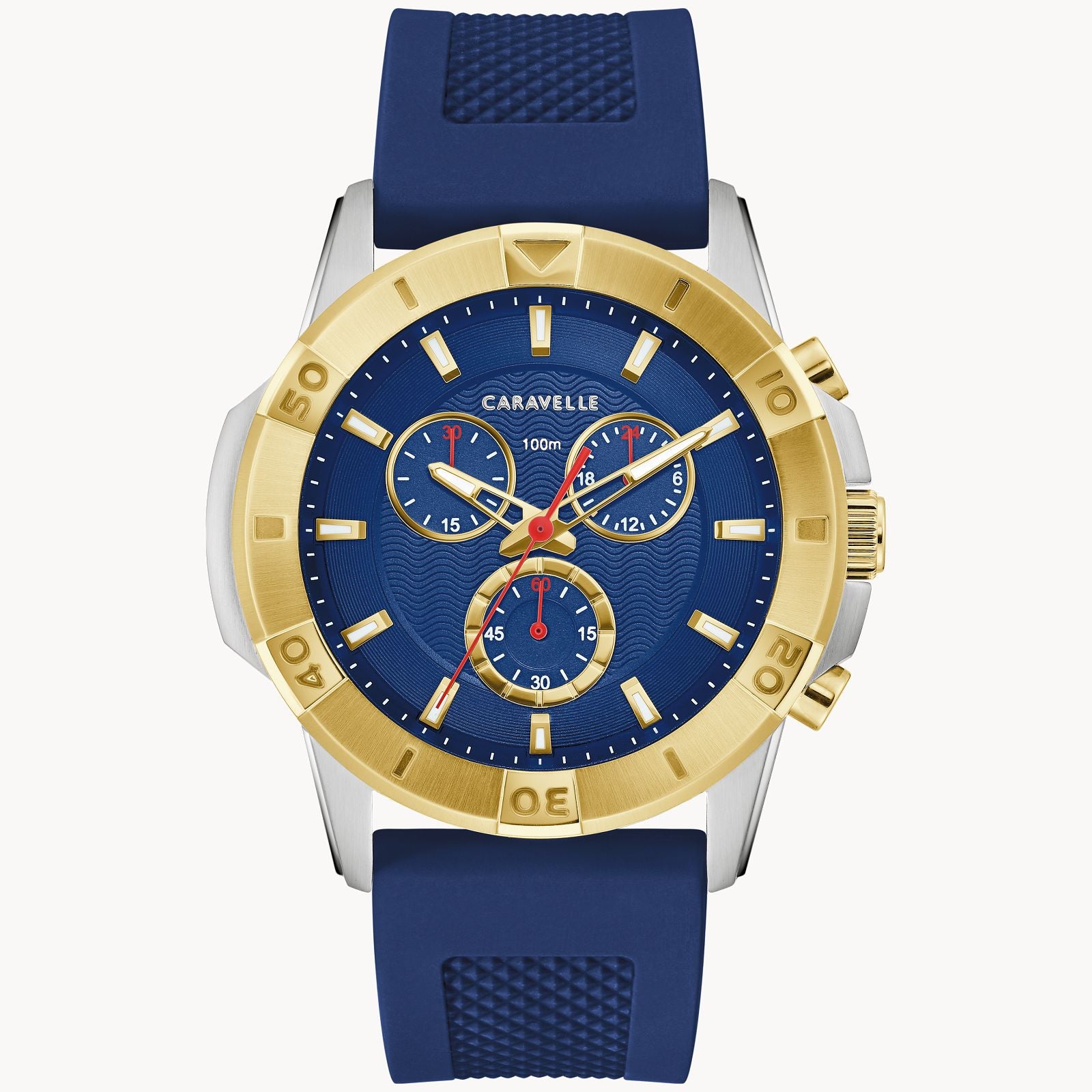Form and function, no compromise needed. Two-tone gold-tone stainless steel case with a uni-directional rotating gold-tone bezel. Blue wave inspired dial texture with luminous hands and markers. Six-hand chronograph movement. Blue silicone strap with three-piece buckle closure. Water resistant to 100 meters.