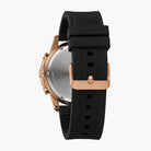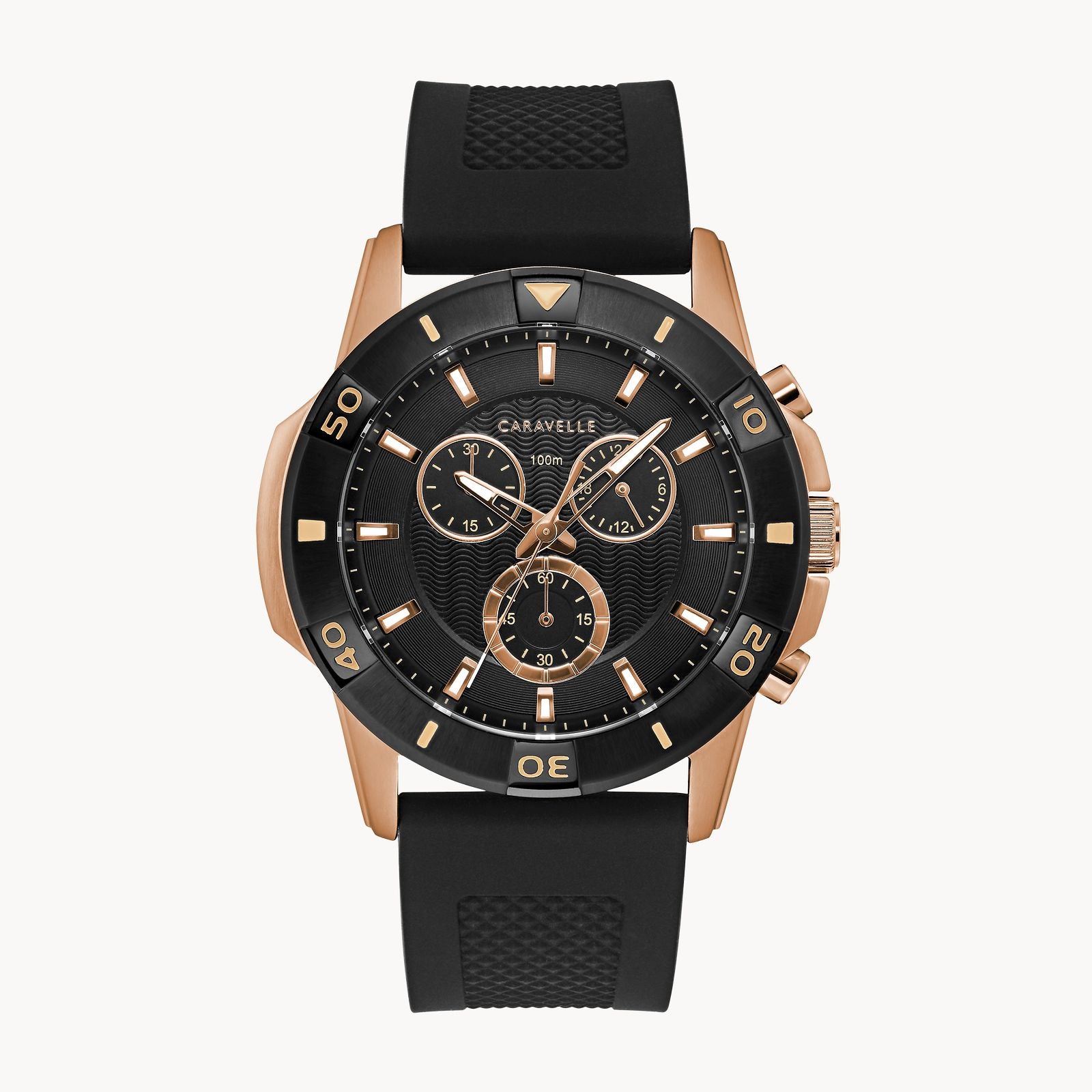 Form and function, no compromise needed. Two-tone rose gold-tone stainless steel case with a uni-directional rotating black bezel. Black wave inspired dial texture with luminous hands and markers. Six-hand chronograph movement. Black silicone strap with three-piece wire closure.
